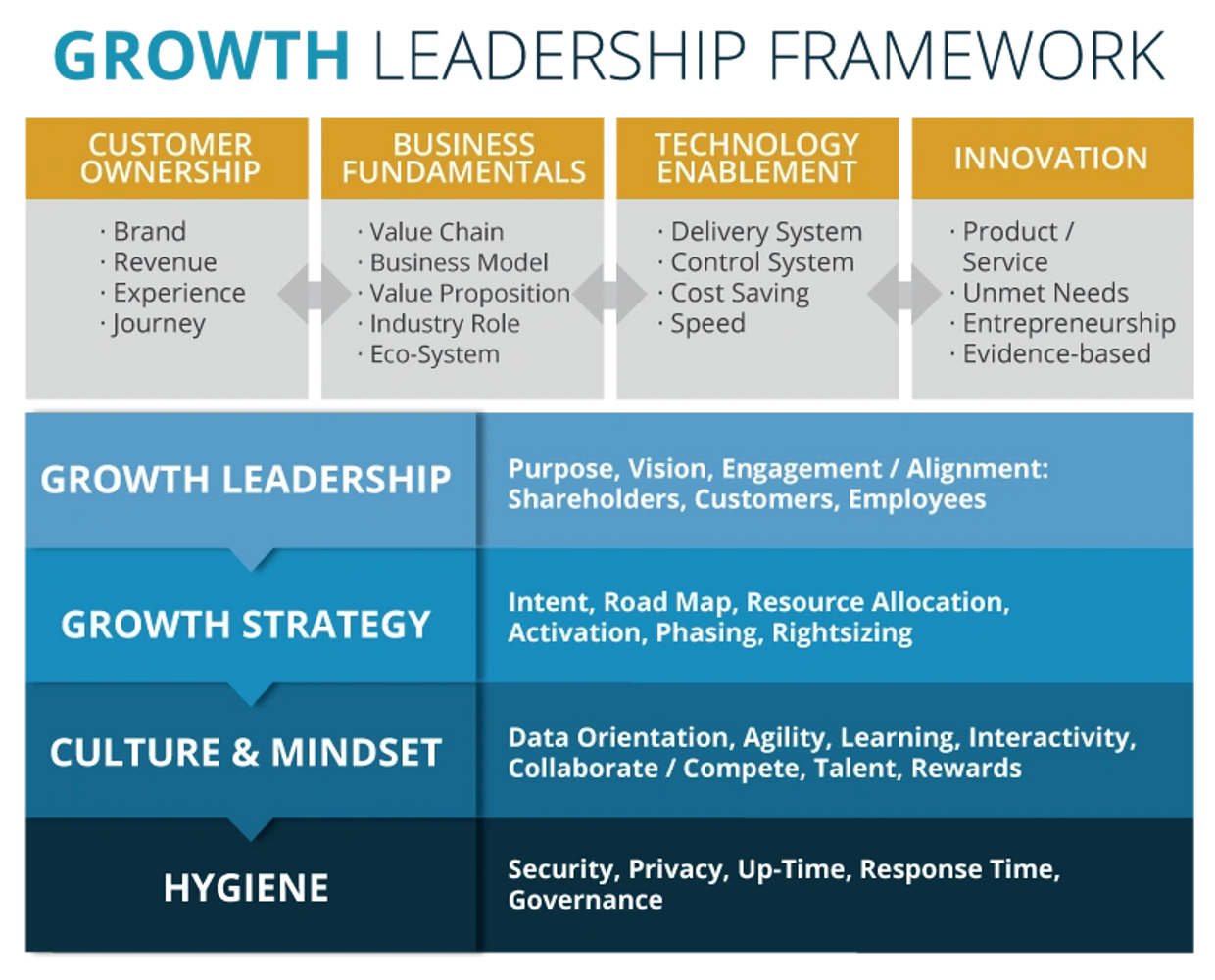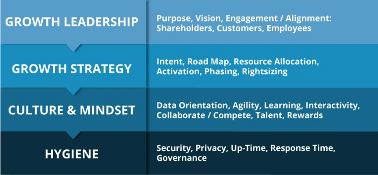The benefits manifested through the four Impact Areas can be huge. Many organizations will want to show progress in one or more of these areas quickly. While that is possible and beneficial, the fundamental, longer term success and profitability of a Digital Transformation or Growth Strategy is enabled by the fundamental leadership elements of these Growth Leadership Areas.